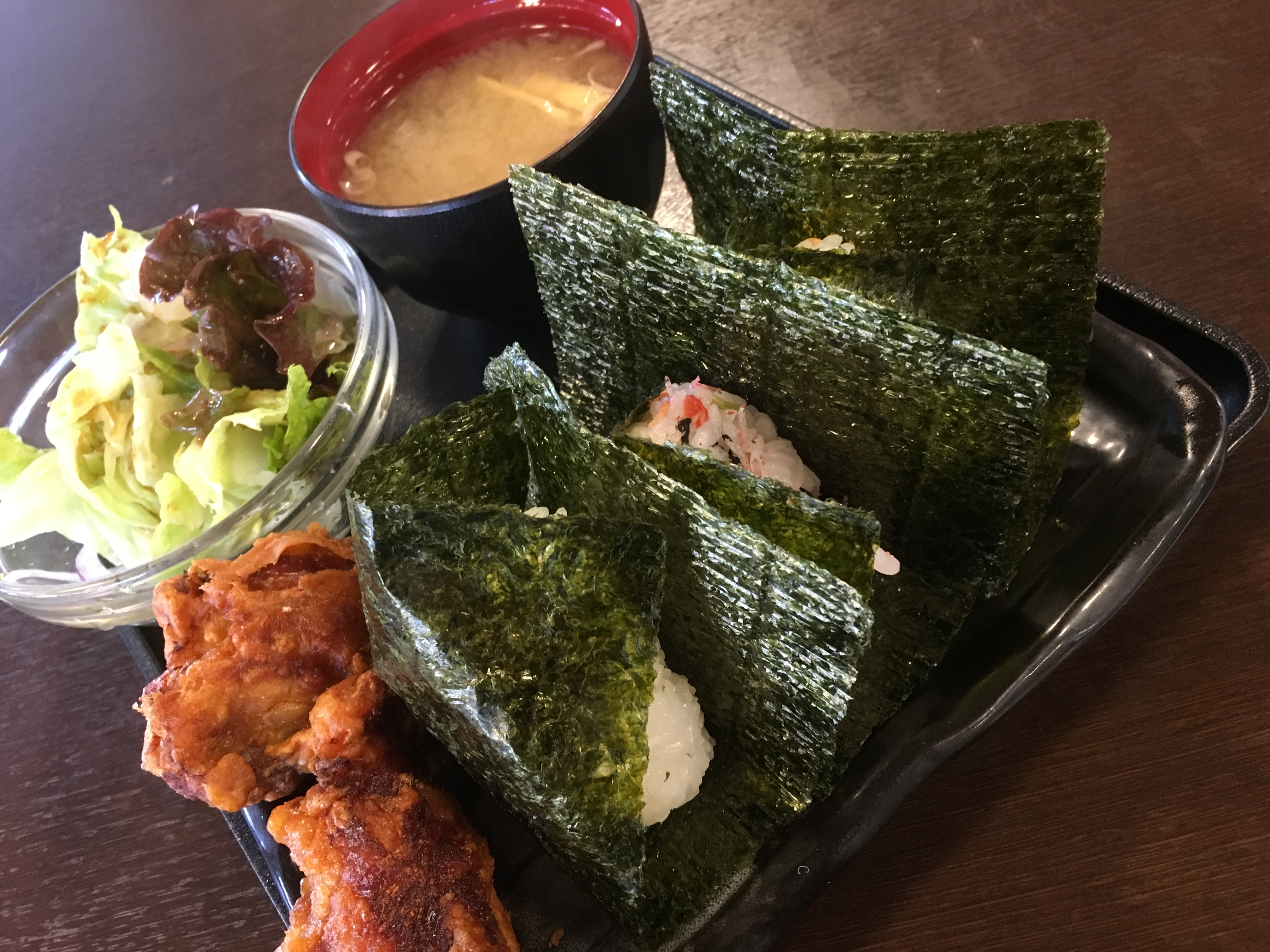 鮭・明太子・梅じゃこ+とりからあげ2個付き!で、なんと500円!(味噌汁、サラダ、お新香付)